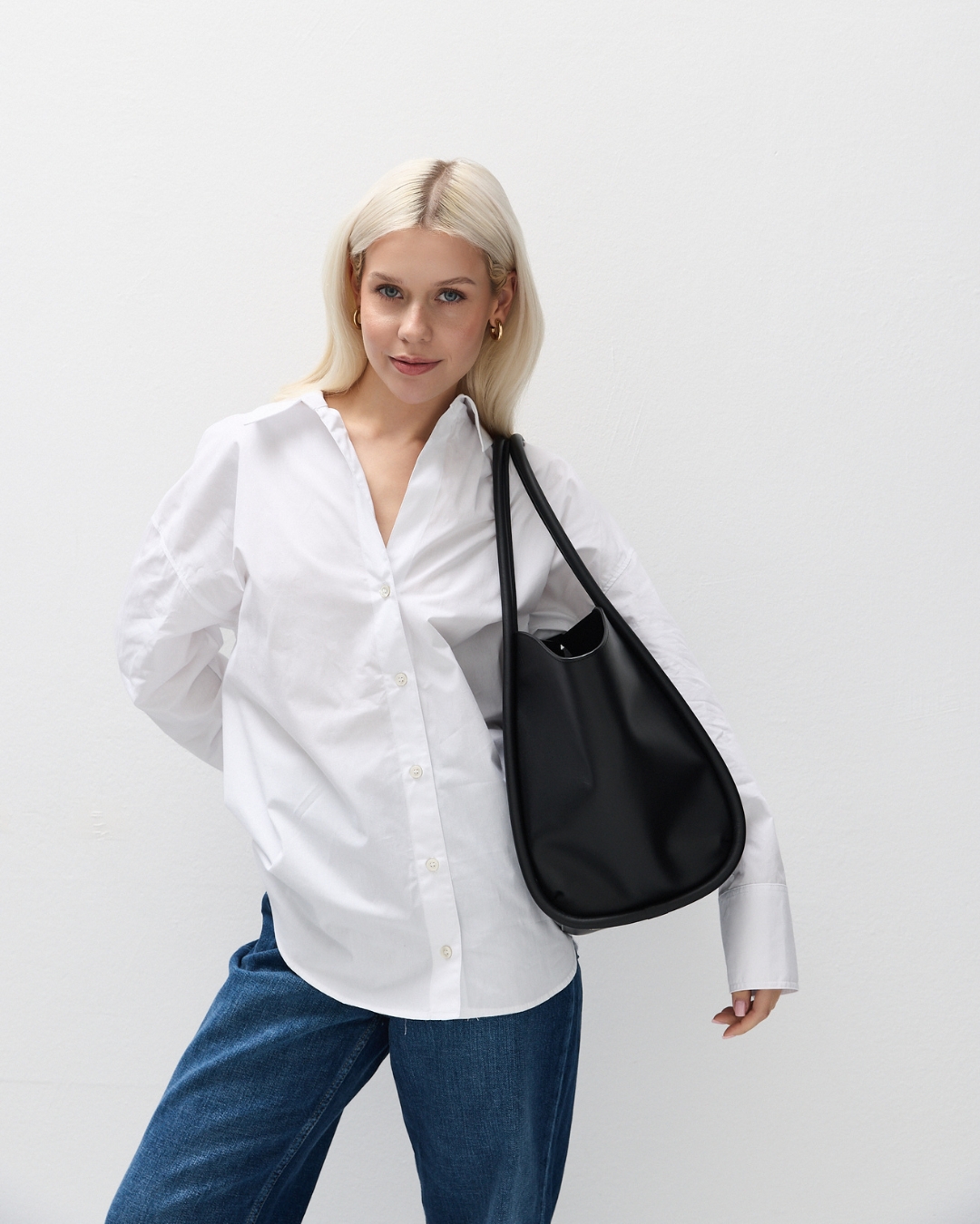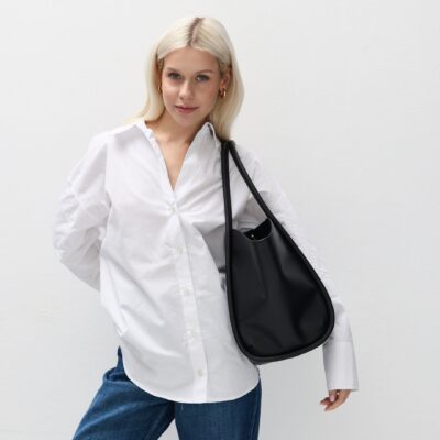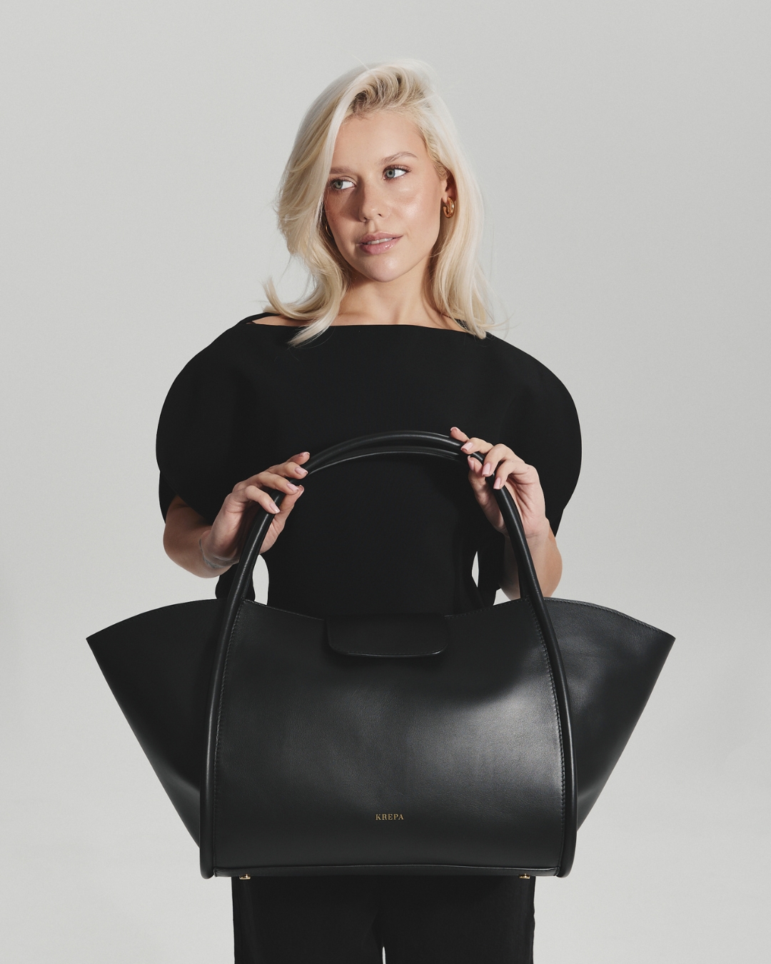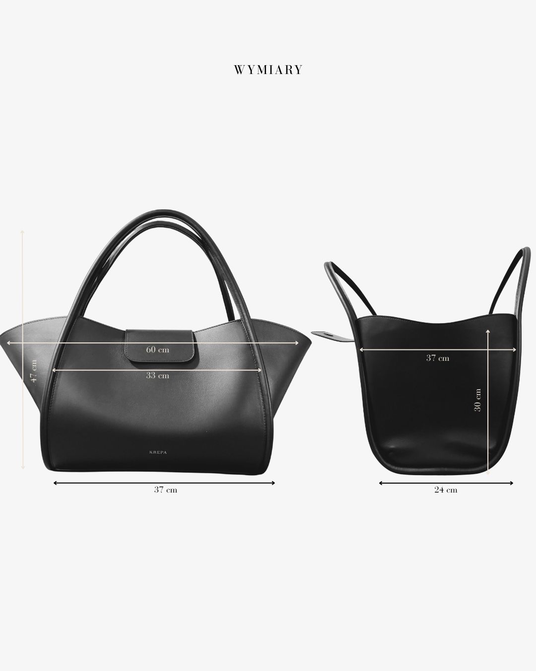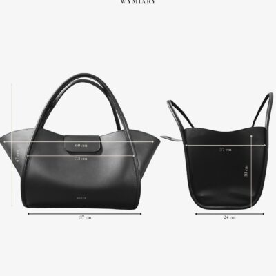 Przeskalowany shopper z małą klapką na ukryty magnes, który pomieści wszystko co niezbędne. Wewnątrz boczna kieszeń zamykana na złoty zamek oraz odpinana saszetka.