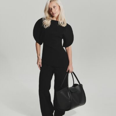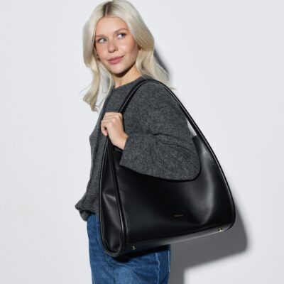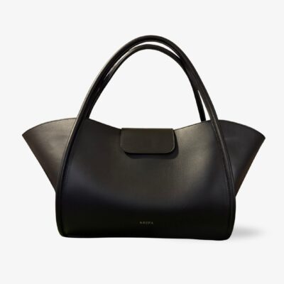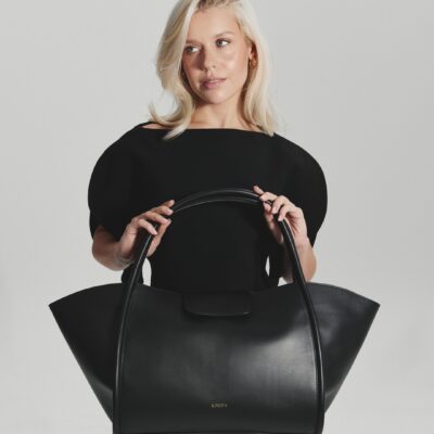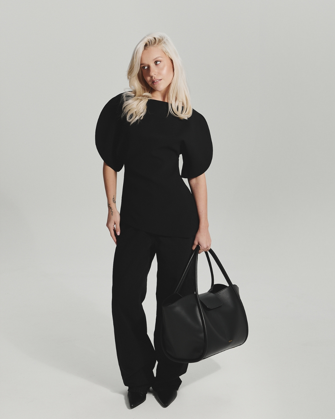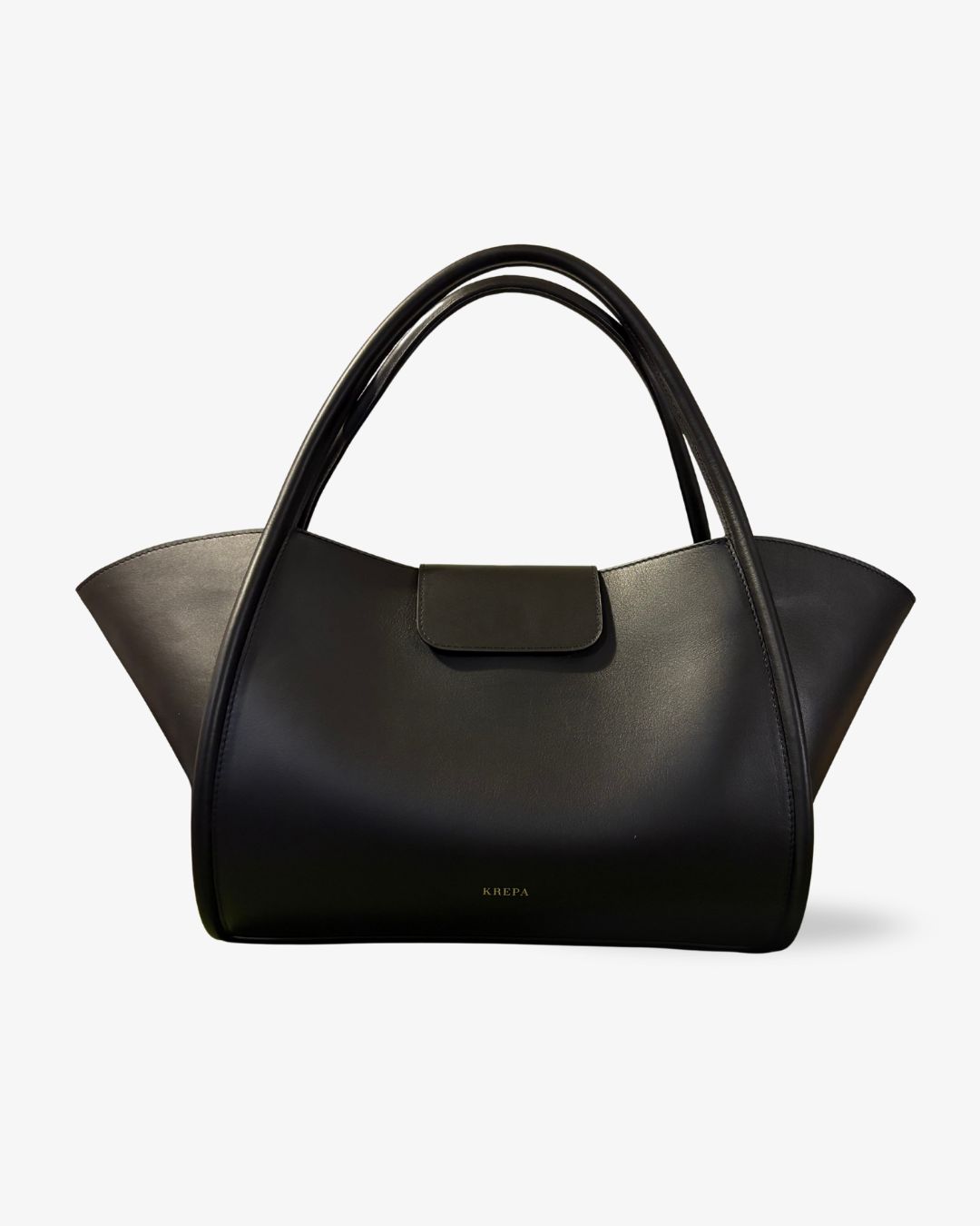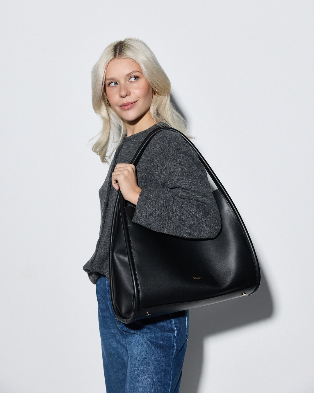Przeskalowany shopper z małą klapką na ukryty magnes, który pomieści wszystko co niezbędne. Wewnątrz boczna kieszeń zamykana na złoty zamek oraz odpinana saszetka.